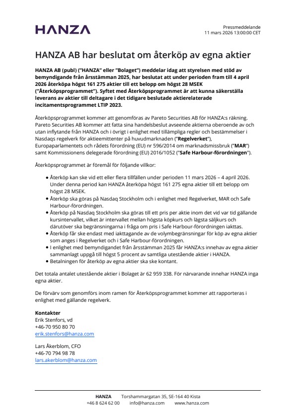 HANZA AB (publ) (”HANZA” eller ”Bolaget”) meddelar idag att styrelsen med stöd av bemyndigande från årsstämman 2025, har beslutat att under perioden fram till 4 april 2026 återköpa högst 161 275 aktier till ett belopp om högst 28 MSEK (”Återköpsprogrammet”). Syftet med Återköpsprogrammet är att kunna säkerställa leverans av aktier till deltagare i det tidigare beslutade aktierelaterade incitamentsprogrammet LTIP 2023.