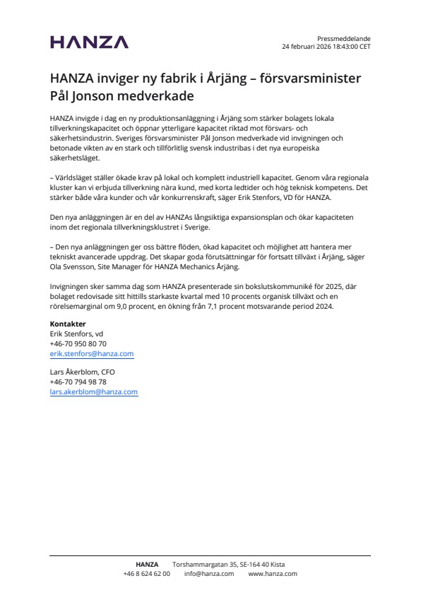Invigningen sker samma dag som HANZA presenterade sin bokslutskommuniké för 2025, där bolaget redovisade sitt hittills starkaste kvartal med 10 procents organisk tillväxt och en rörelsemarginal om 9,0 procent, en ökning från 7,1 procent motsvarande period 2024.