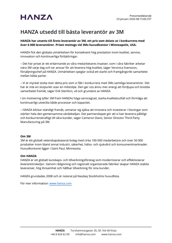 – Vi är mycket stolta över detta pris som vi fått i konkurrens med 3Ms samtliga leverantörer. Det här är inte en slutpunkt utan en milstolpe. Den ger oss ännu mer energi att fördjupa och bredda samarbetet framåt, säger Erik Stenfors, vd och grundare av HANZA.