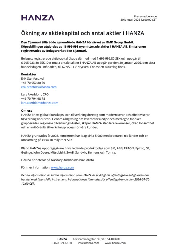 Bolagets registrerade aktiekapital ökade därmed med 1 699 999,80 SEK och uppgår till 6 295 933,80 SEK. Det totala antalet aktier i HANZA AB uppgår per den 30 januari 2026, den sista handelsdagen i månaden, till 62 959 338 stycken. Endast ett aktieslag finns.